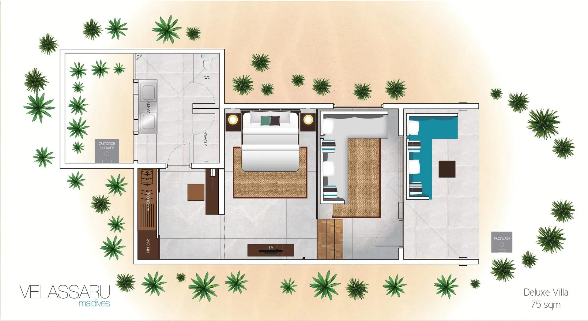 Площадь номера — 75 кв.м. Береговая вилла, расположенная в саду. Состоит из спальни с большой двуспальной кроватью и зоной отдыха; ванной комнаты в саду с крытым и открытым душам; террасы с лежаками и выходом к пляжу. ПЛАН НОМЕРА