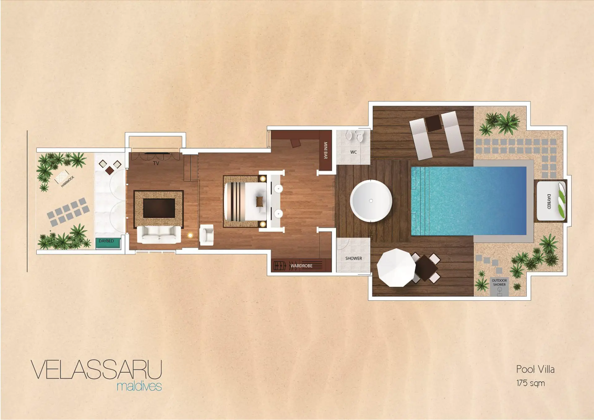 Площадь номера — 112 кв.м. Водная вилла с бассейном. Состоит из спальни с большой двуспальной кроватью и зоны для дневного отдыха; ванной комнаты с ванной и душем; террасы с бассейном, лежаками и спуском в лагуну. ПЛАН НОМЕРА