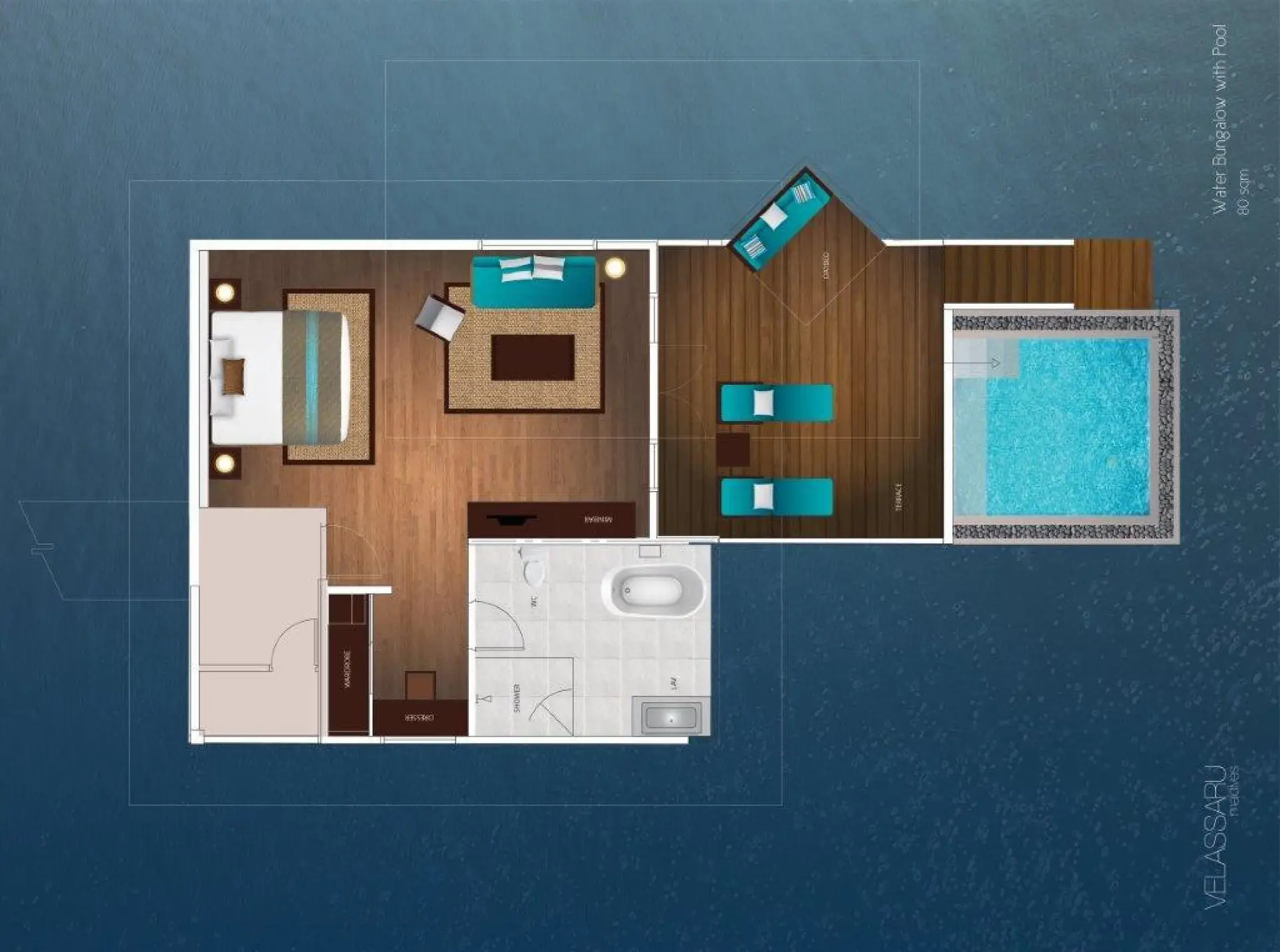 Площадь номера — 80 кв.м. Водное бунгало с бассейном и видом на лагуну. Состоит из спальни с большой двуспальной кроватью и зоной для отдыха; ванной комнаты с ванной и душем; террасы с лежаками, бассейном и спуском в лагуну. ПЛАН НОМЕРА